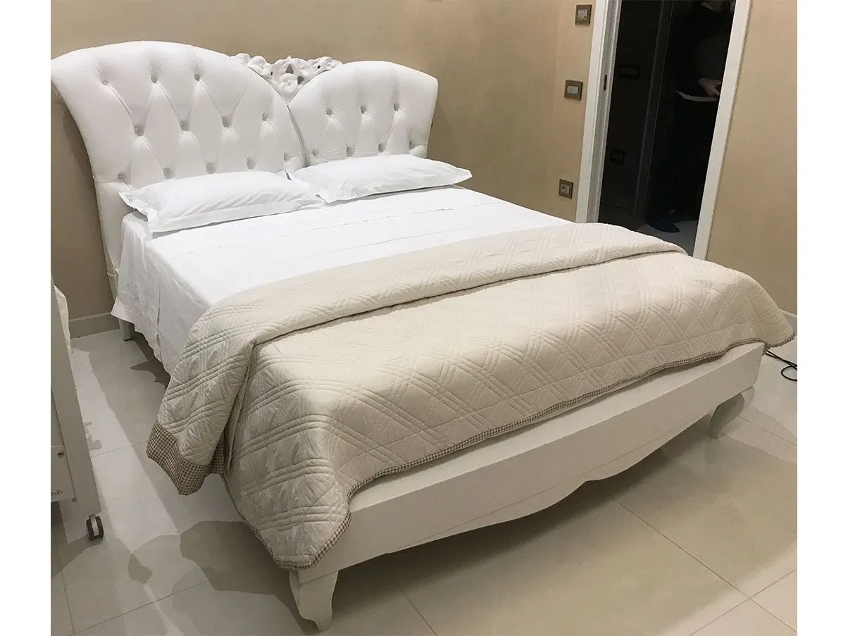Precious finishes and unique details, in pure Provencal style, with shabby chic references: we are talking about the double bed from the I Sogni Notte collection, produced by Maestri Artigiani. The bed has a real leather headboard with stitching, capitonné effect, white finish. The bed frame is instead in white painted wood, which is also found in the decoration with calle painted white solid on the head. Romantic and soft lines, ideal for giving a chic touch to the sleeping area. Complementary accessories not included.