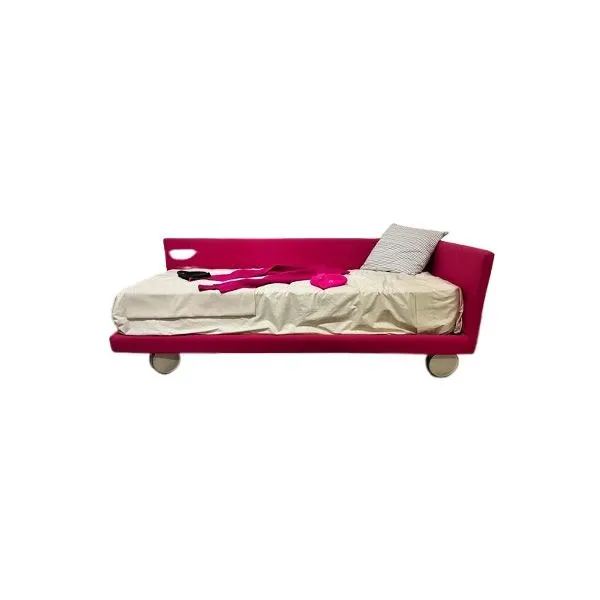 Manhattan bed with wheels, Dielle. Bed base (for mattress measuring 200 x 90 cm) and headboard, mattress excluded. In perfect condition. This padded and ergonomic bed offers effective support, featuring a practical headboard that extends laterally for greater support. A great addition to your bedroom, the contemporary style and vibrant color of the fabric make it a modern and stylish product