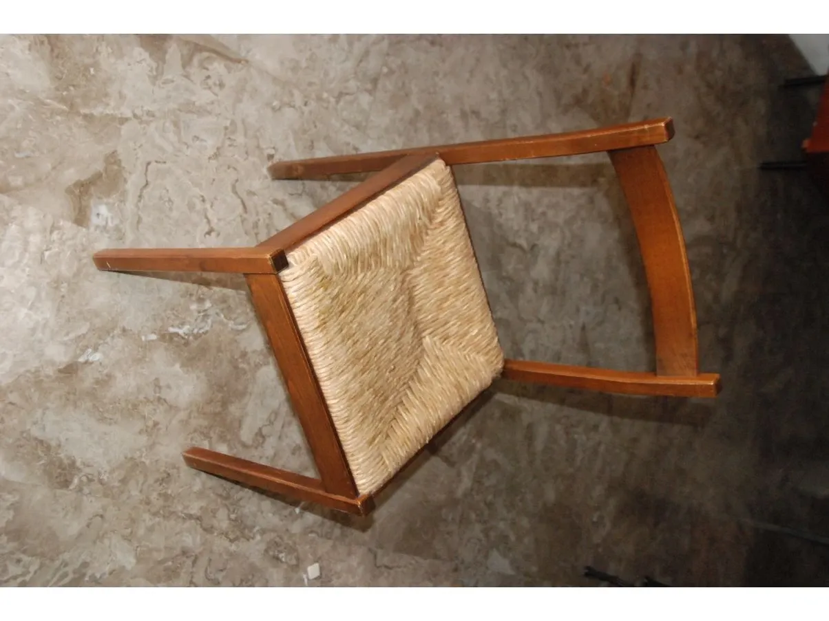 Vintage chair in wood and straw (1970s), with slight signs of wear due to use. Available 6 pieces. Beige straw background and brown wooden structure. They are a great addition to any environment. This set of chairs has a golden straw finish and a wooden frame. The seat is high and comfortable, with a wide backrest that offers a feeling of comfort and support. The combination of materials offers a touch of style and personality, making the chairs unique and special