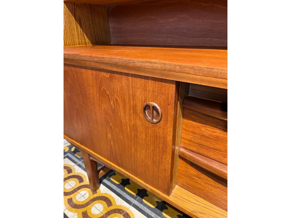 Credenza vintage anni ‘50. Struttura in teak con 2 ante a vetro scorrevoli nella parte alta e 2 ante nella parte centrale. Nella zona bassa 1 anta scorrevole e cassetti a scomparsa. Questa credenza è un’ ottima scelta d’ arredo per la tua cucina, spaziosa e capiente risulta funzionale e pratica all’ utilizzo
