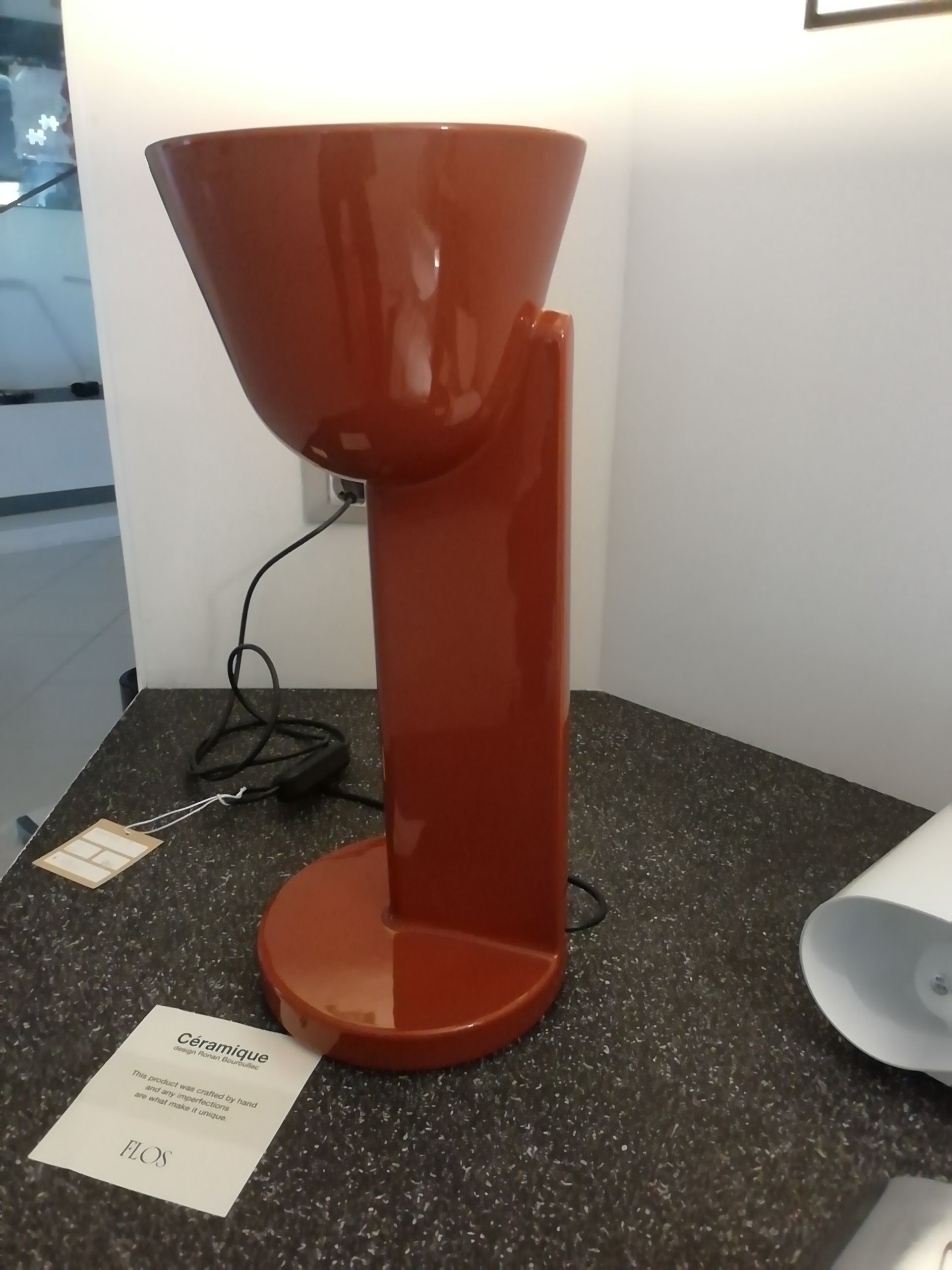 La lampada da tavolo si distingue per il suo corpo iconico in ceramica, lavorato a mano e rifinito con una smaltatura cristallina laccata senza piombo, che ne esalta le forme e la texture artigianale. Il diffusore bianco in policarbonato garantisce una luce morbida e omogenea, perfetta per ambienti living o zone notte. Dotata di attacco per lampadina E27, è compatibile con diverse soluzioni luminose. Nota: la lampada presenta una lieve scheggiatura sul retro della base, non visibile frontalmente e che non compromette la funzionalità o l’estetica generale del pezzo.