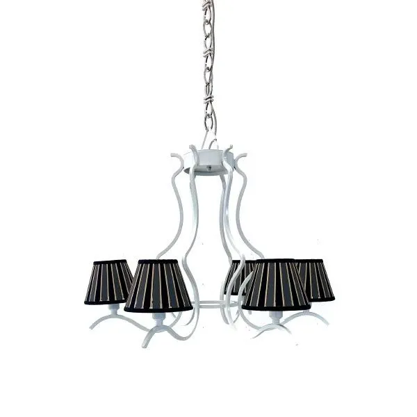 Lampadario a 6 luci di Patrizia Garganti, diametro cm 70 h cm 60 con catena aggiuntiva in finitura nichel, paralumi realizzati con nastri di cotone colore grigio e nero e pelle avorio. Il lampadario a 6 luci è un elemento d’ arredo di valore che non passa inosservato, dalle linee eleganti e raffinate è un’ aggiunta di grande effetto per arredare i tuoi spazi