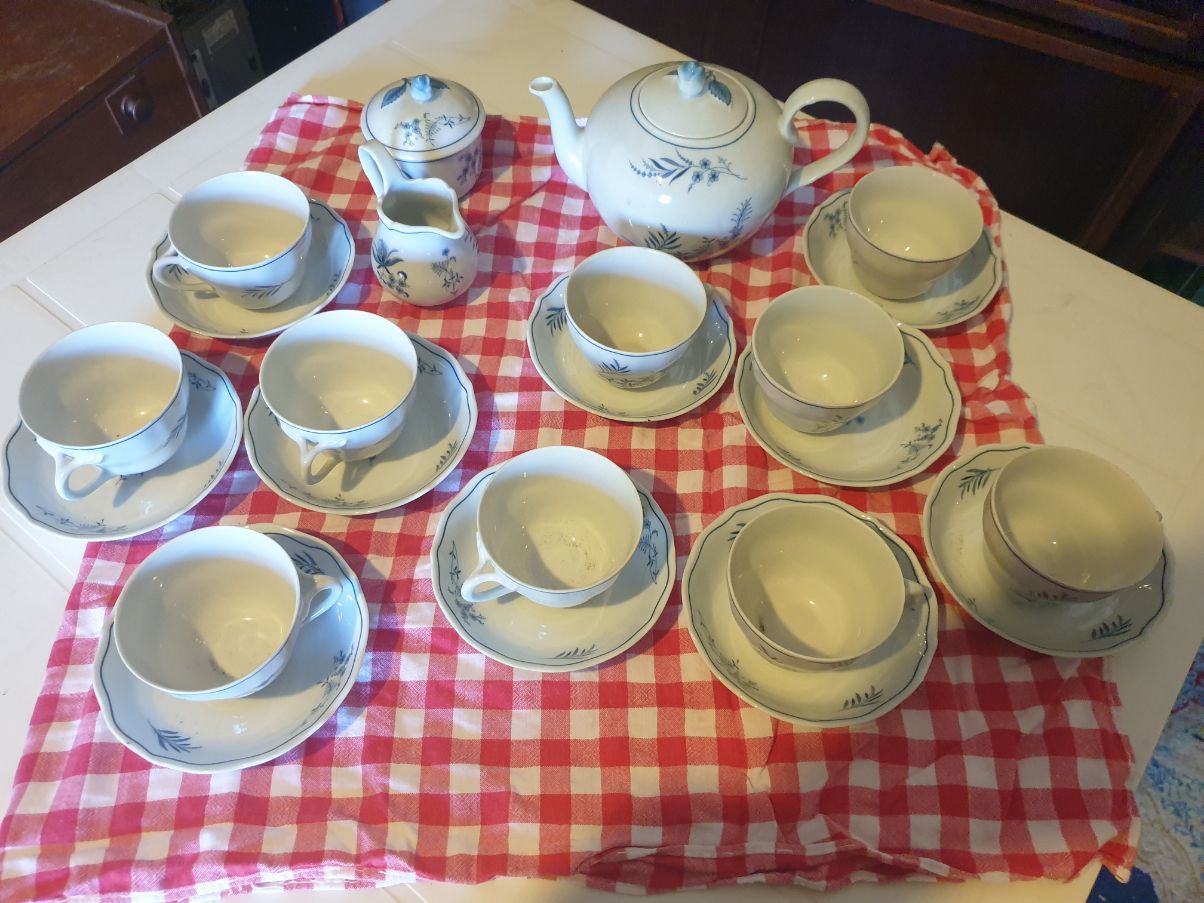 Servizio da tè in porcellana bianca decorato con delicatissimi fiorellini azzurri. E’ composto da 10 tazze e 10 piattini, lattiera, zuccheriera e teiera. Un servizio raffinato e dal fascino antico, perfetto da scegliere nei momenti di pausa come accessorio in stile vintage per abbellire una tavola elegante