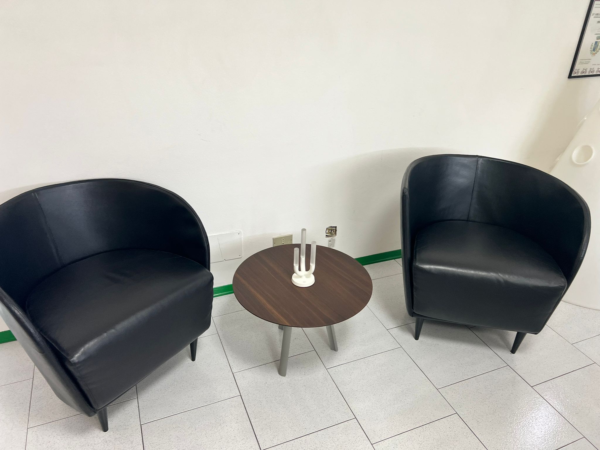 Un'elegante combinazione pensata per arricchire salotti, sale d’attesa, uffici o ambienti contract. Il design essenziale e raffinato di questo set lo rende estremamente versatile, perfetto per creare spazi accoglienti e professionali. Le due poltroncine presentano un rivestimento in Sky nero, dall’aspetto sofisticato e facilmente lavabile, con piedi anteriori in legno nero. La seduta è comoda e ben proporzionata, ideale per momenti di attesa o relax. Il tavolino rotondo, con struttura color tortora e piano in finitura noce tinto, completa il set con un contrasto materico e cromatico equilibrato. Il diametro di 60 cm lo rende pratico per appoggiare riviste, oggetti o bevande, senza occupare troppo spazio.