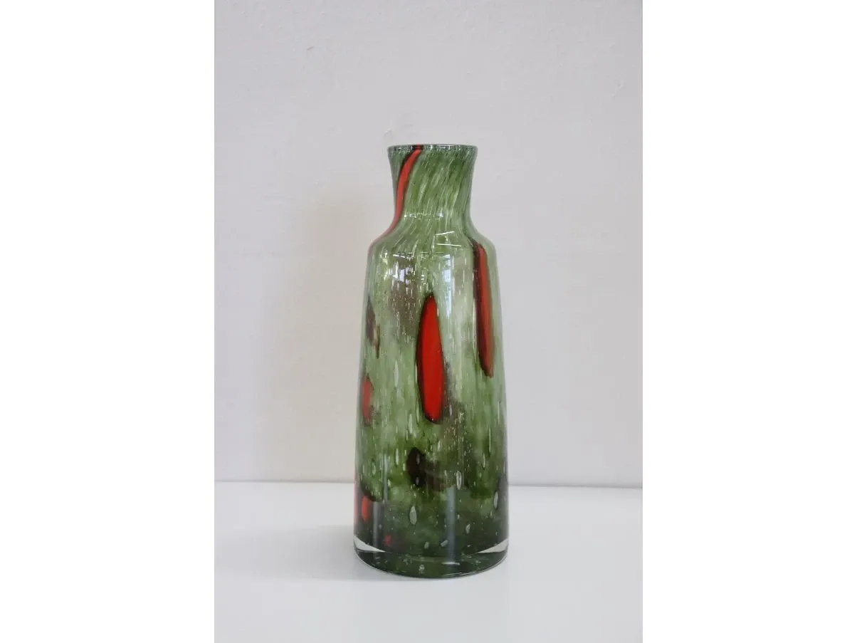 Vaso in vetro di Murano vintage verde e rosso, produzione 1960, Murano. Non firmato. Vetro soffiato a mano di alta qualità artistica nei toni del verde con decorazioni rosse. Perfette condizioni. Questo vaso a bottiglia è una vera e propria scultura ricca di storia e tradizioni. Simbolo di un patrimonio culturale e artistico, questo pezzo di design vintage è un elemento decorativo che si abbina ad ogni stile di arredamento, dal classico al contemporaneo per un ambiente sofisticato ed elegante